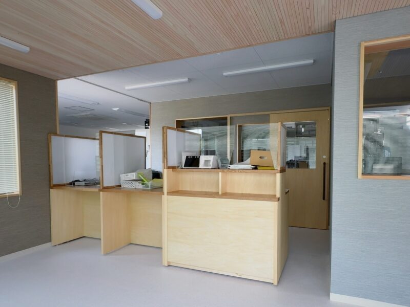 しかし、少人数での効率的な運用を実現するため、調剤室の角にL字型の受付スペースをまとめて配置。スタッフの動線を短縮しながらも、待合室は内科と小児科で完全に分離できるレイアウトになりました。