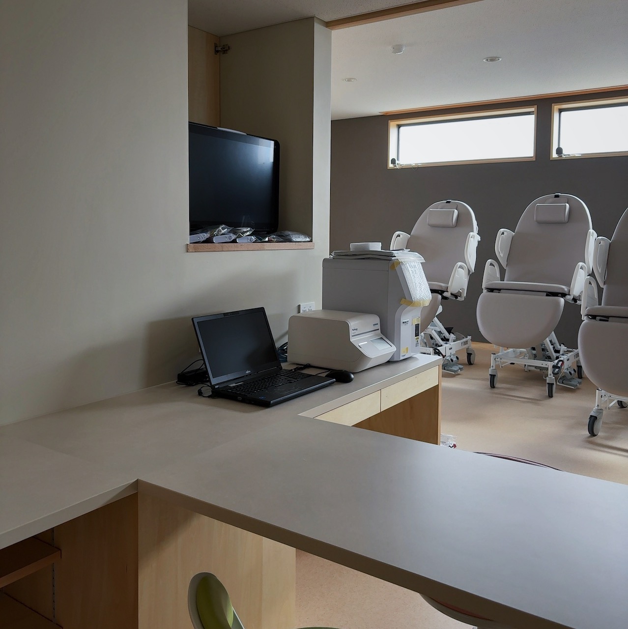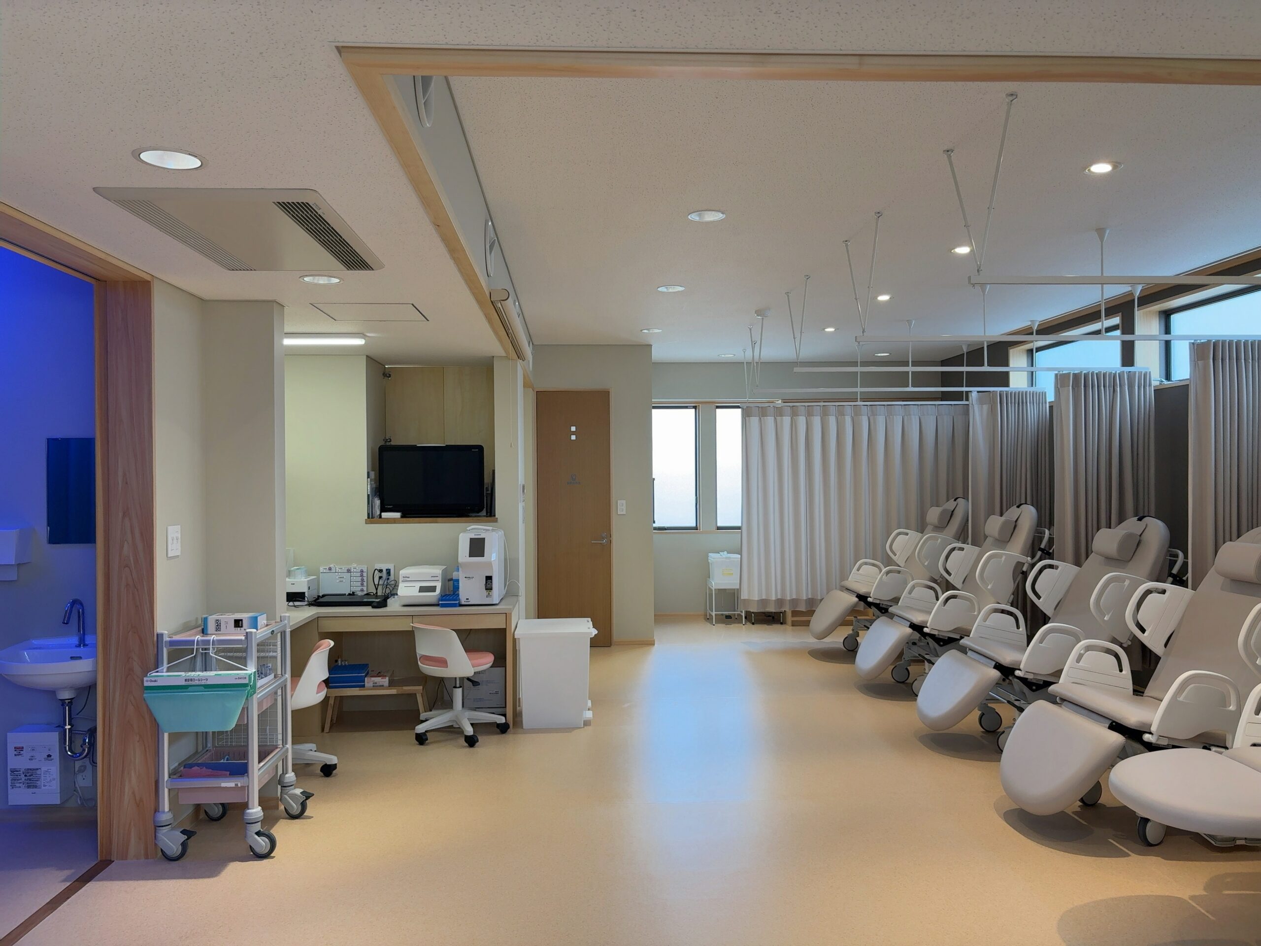 スタッフからの視認性を保ちつつ、カーテンの仕切りで半個室をつくりプライバシーを確保しました。