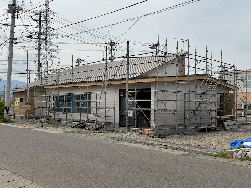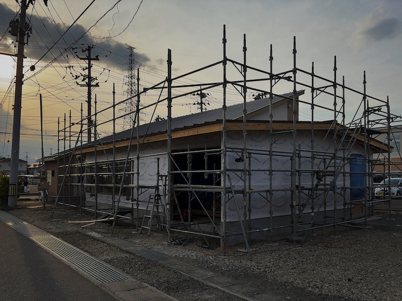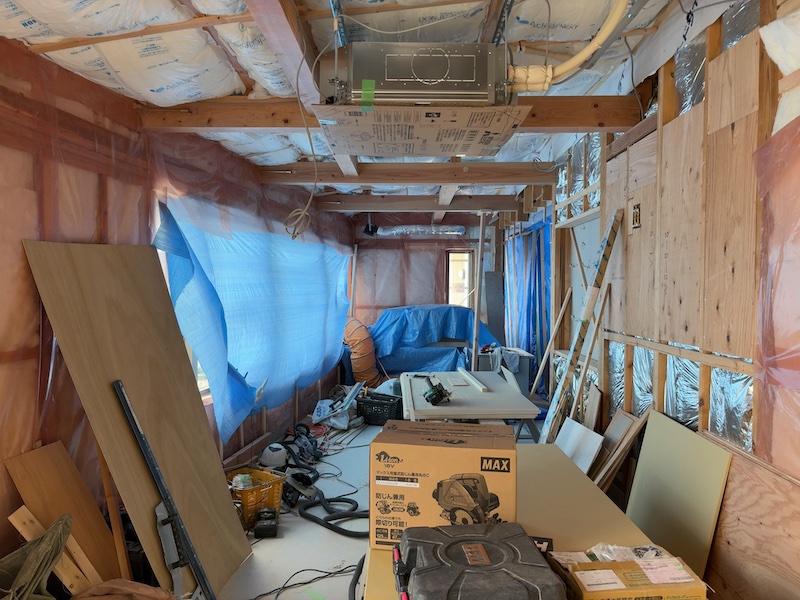 ここからは、既存部分の改修も並行して進んでいきます。写真右手は既存部ですので、ブルーシートで養生をしています。