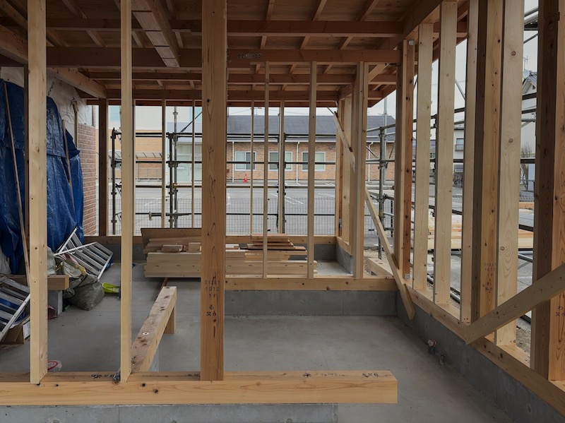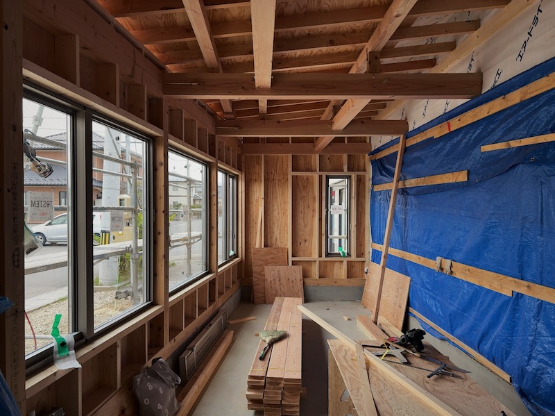 建て方が終わると外壁に下地の面材を取付けサッシを設置していきます。ここまでくると、室内外のつながりや自然光の入り方、その”陰影”が実感できるようになります。