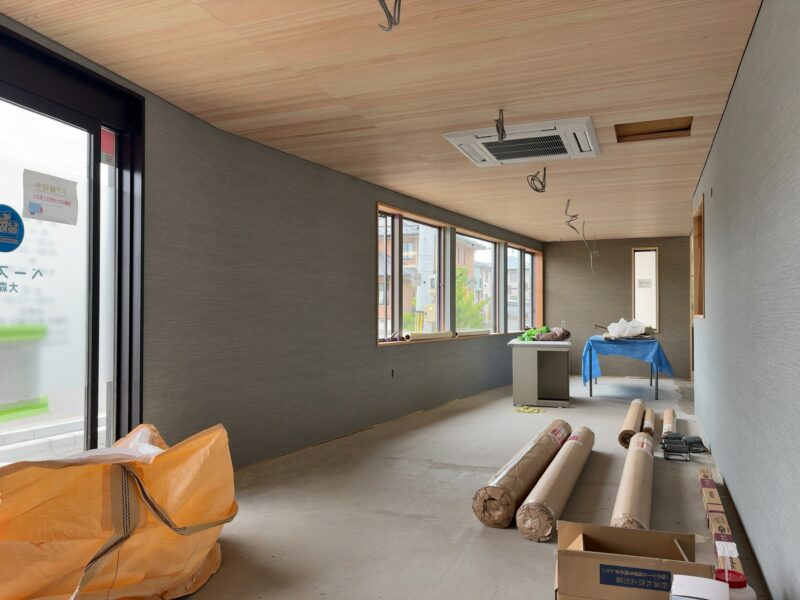 写真は、天井・壁の仕上げが終わり、これから床仕上げをするところです。手前のロールが塩ビシート。